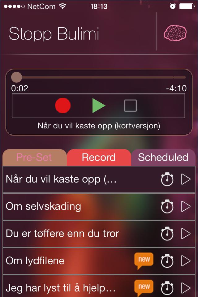 Stopp Bulimi est développé en collaboration avec des personnes aux prises avec des vomissements répétés ou similaires. Bumimi est un diagnostic, mais l'application a un contenu pertinent pour les personnes diagnostiquées est en train de développer le trouble et leur plus proche.